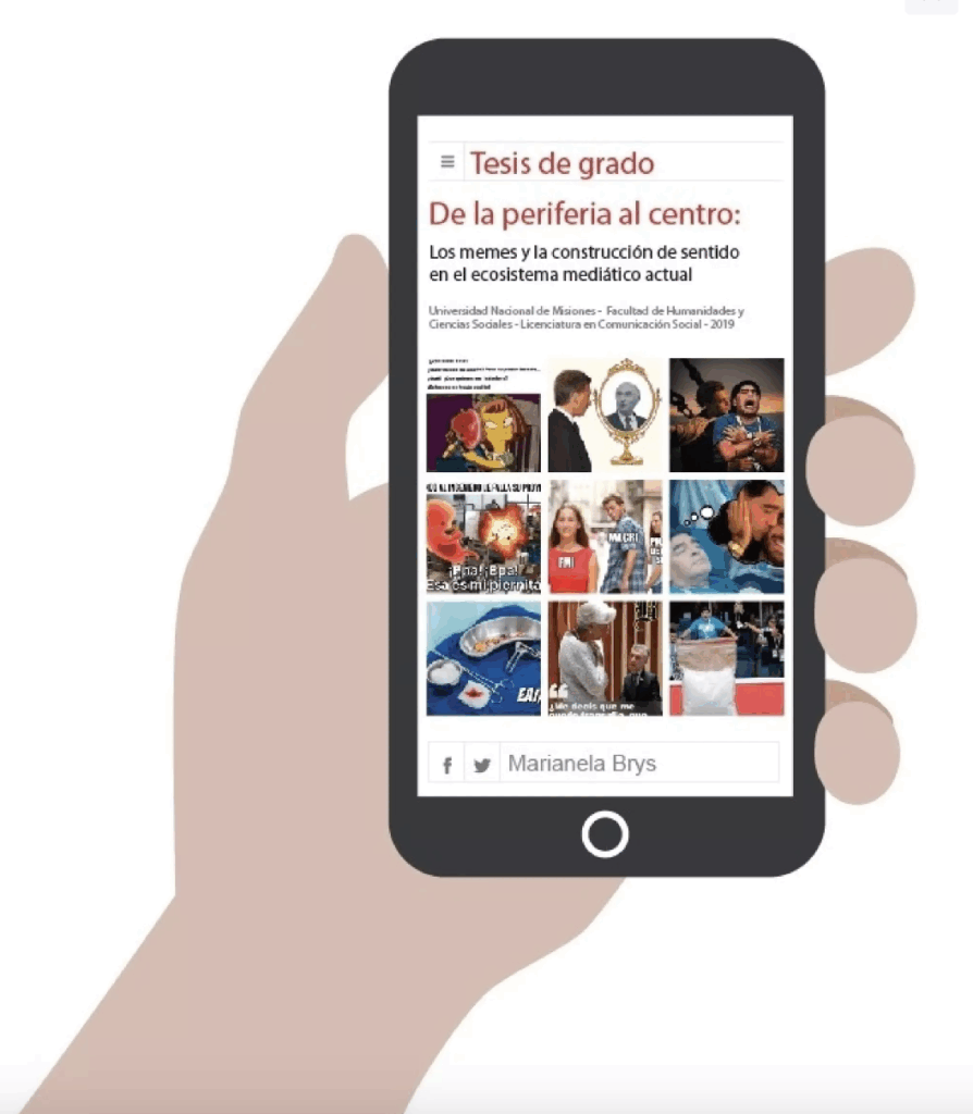 ¿Qué son los memes? ¿Cómo contruyen sentido? Estas y otras preguntas son las que Marianela Brys trató de responder en esta tesis escrita y defendida en el 2019 para la obtención del título de licenciada en Comunicación Social con orientación en periodismo en la Facultad de Humanidades y Ciencias Sociales de la Universidad Nacional de Misiones. Fue dirigida por la docente Patricia Bertolotti y co-dirigida por Tania Piris da Motta.